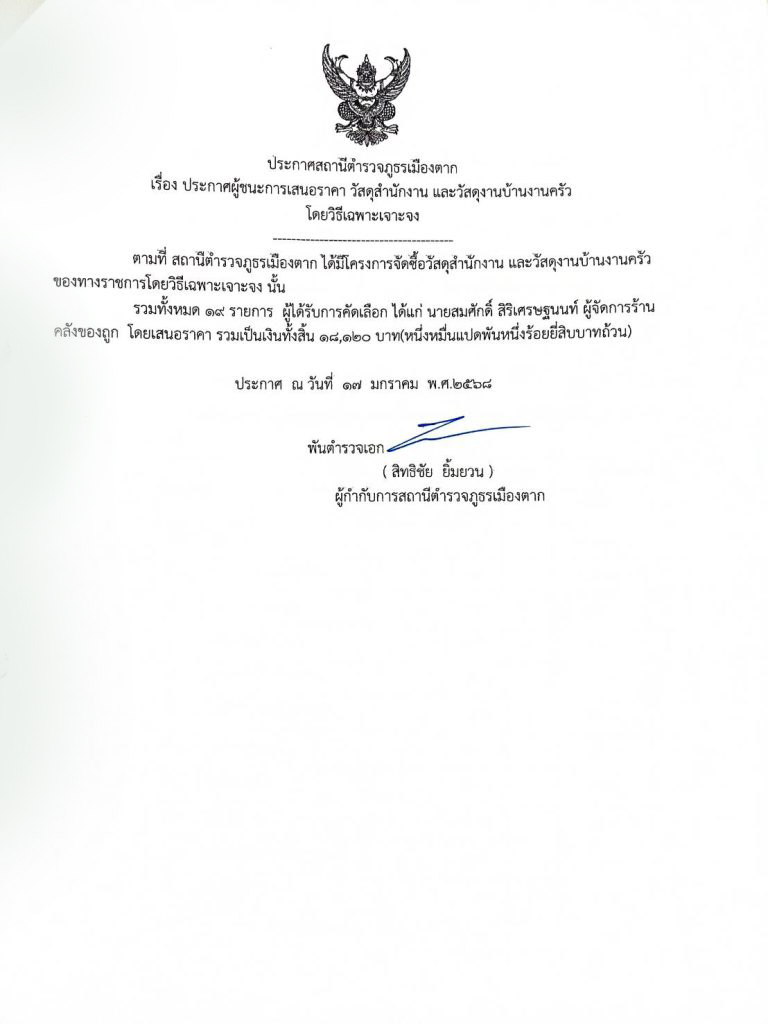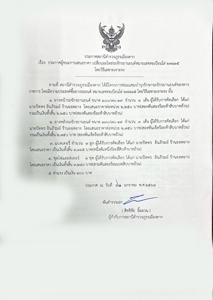 ประกาศจัดซื้อจัดจ้างประจำเดือน มกราคม 2568 1 กุมภาพันธ์ 2568 โดย admin / ข่าวจัดซื้อจัดจ้าง ประกาศผู้ชนะการเสนอราคา วัสดุสำนักงาน และวัสดุงานบ้านงานครัว โดยวิธีเฉพาะเจาะจง ประกาศผู้ชนะการเสนอราคา เปลี่ยนอะไหล่รถจักรยานยนต์หมายเลขทะเบียนโล่ 27815 โดยวิธีเฉพาะเจาะจง Facebook iconFacebookTwitter iconTwitterLINE iconLine